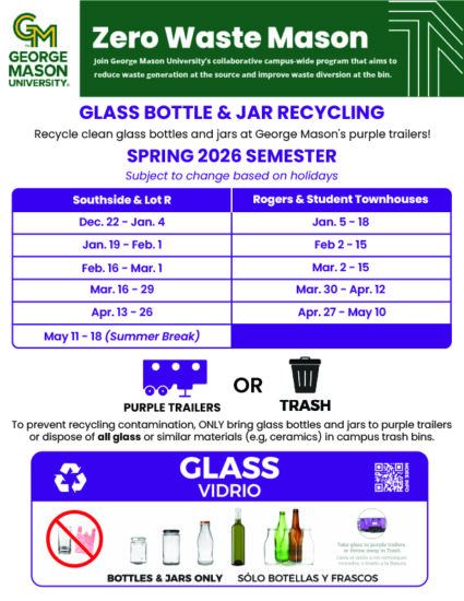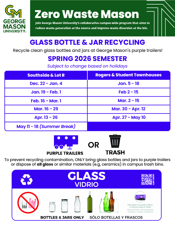 This program does not extend to all of Mason's campuses yet! If you can't visit a pilot drop-off location on the Fairfax Campus, please dispose of glass in labeled Trash bins or bring clean glass jars and bottles to your nearest off-campus Purple Can Club location for recycling.